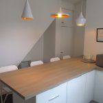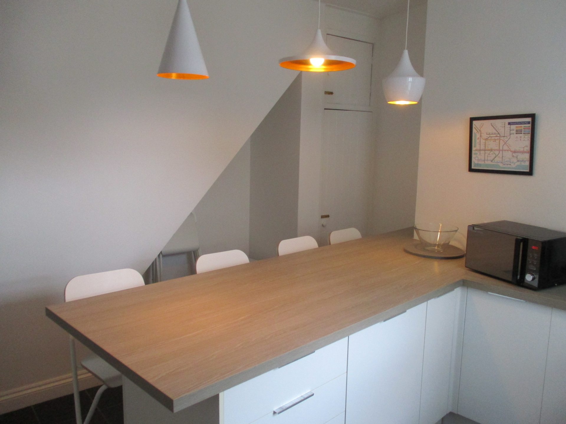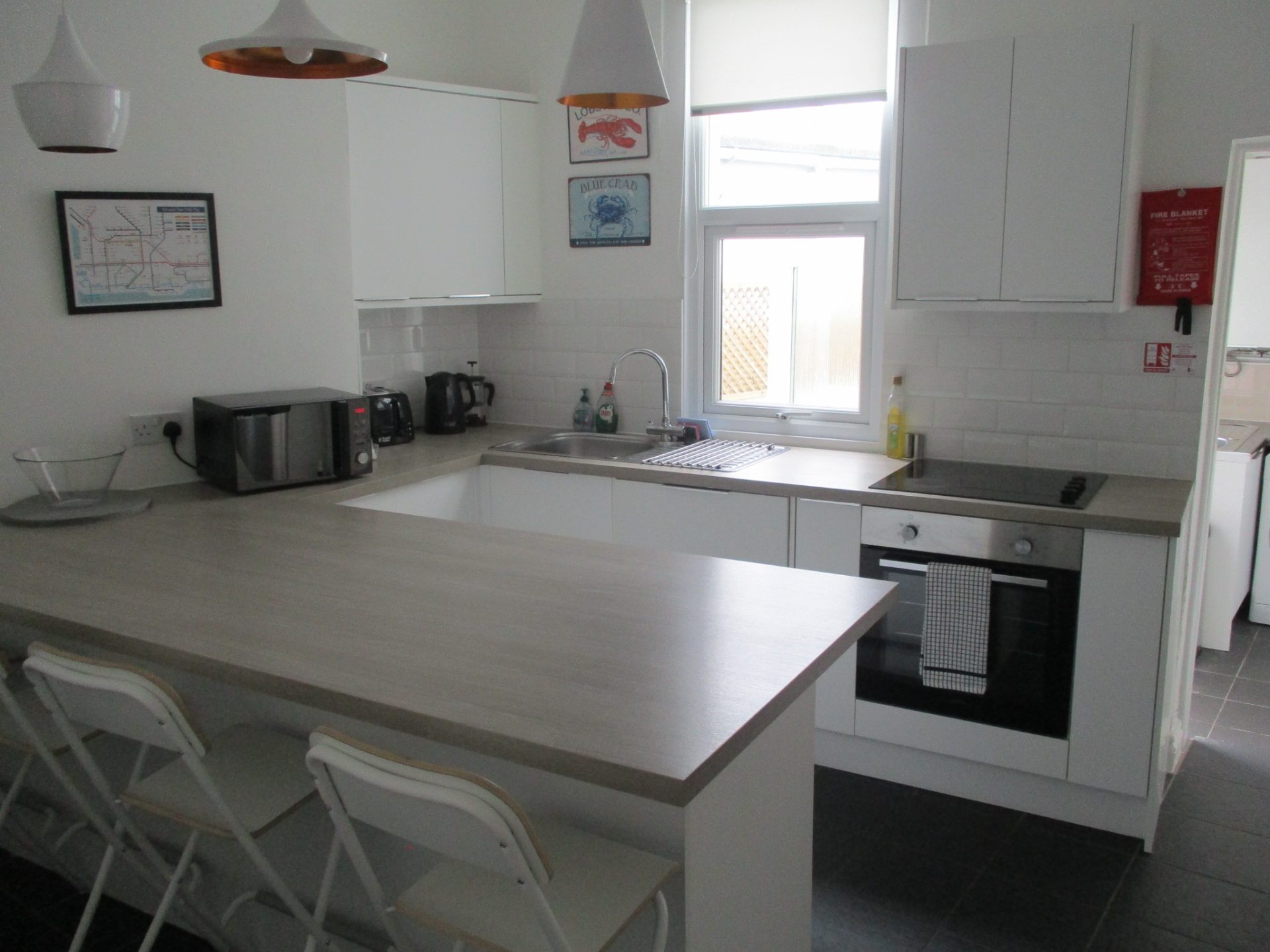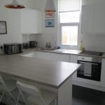 Kitchen with breakfast bar, electric hob, electric oven, integrated fridge and integrated dishwasher