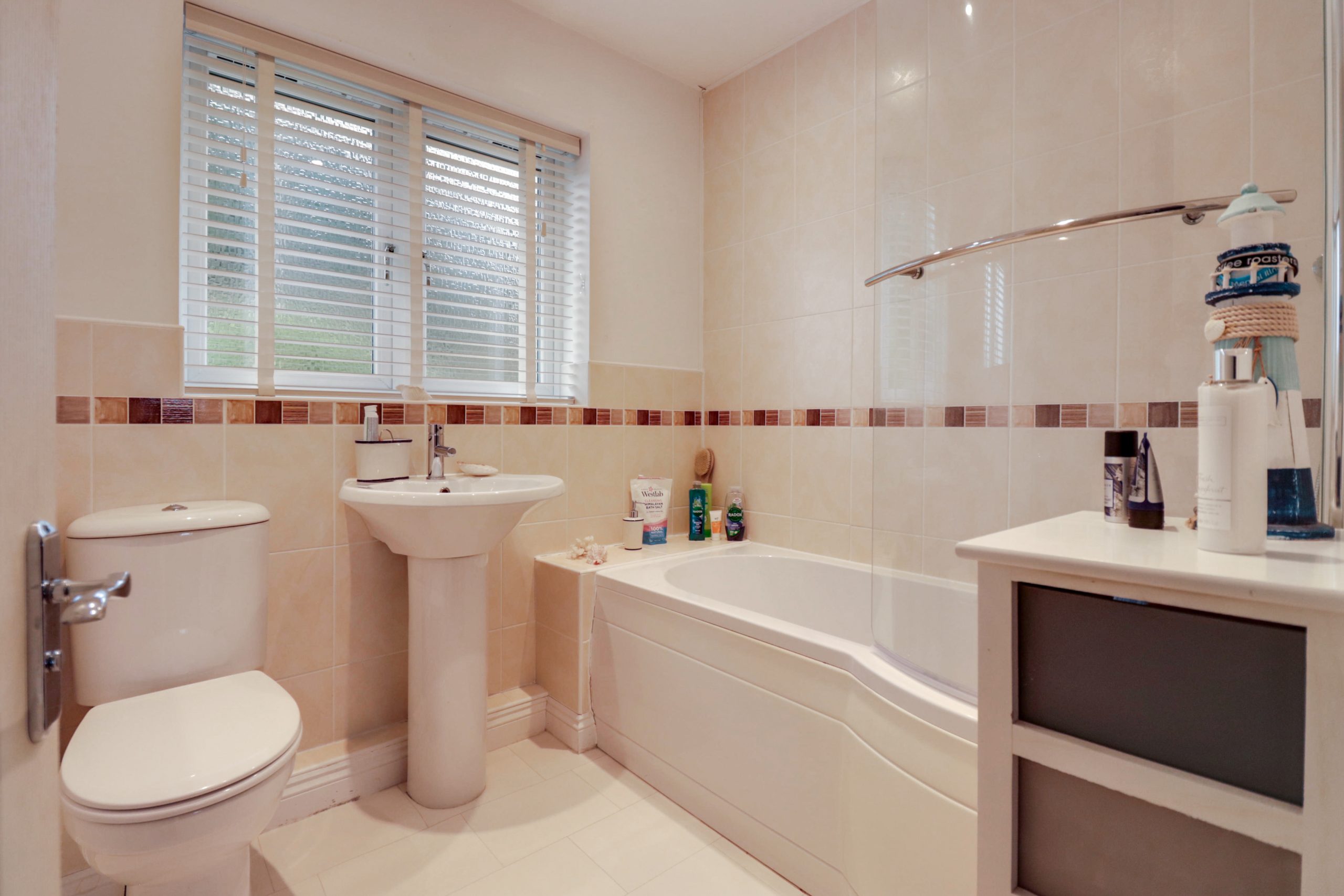 Family bathroom with bath and shower over