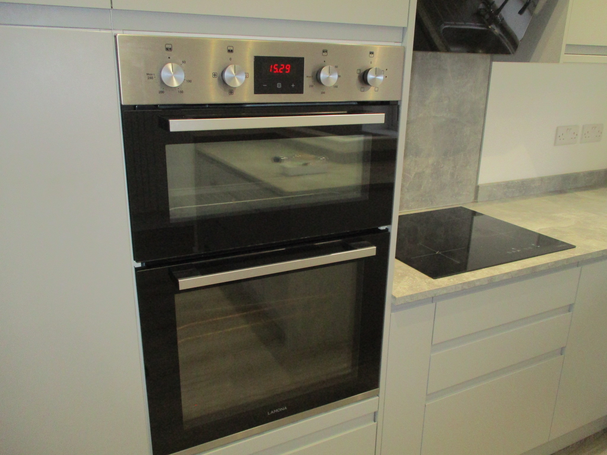 Kitchen area with Integrated fridge and dishwasher, double oven and electric hob