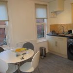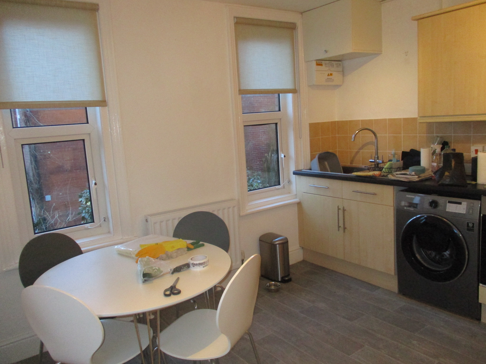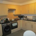 Kitchen / dining room with modern fitted kitchen, oven and hob and plumbing for washing machine. Free standing fridge/freezer