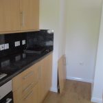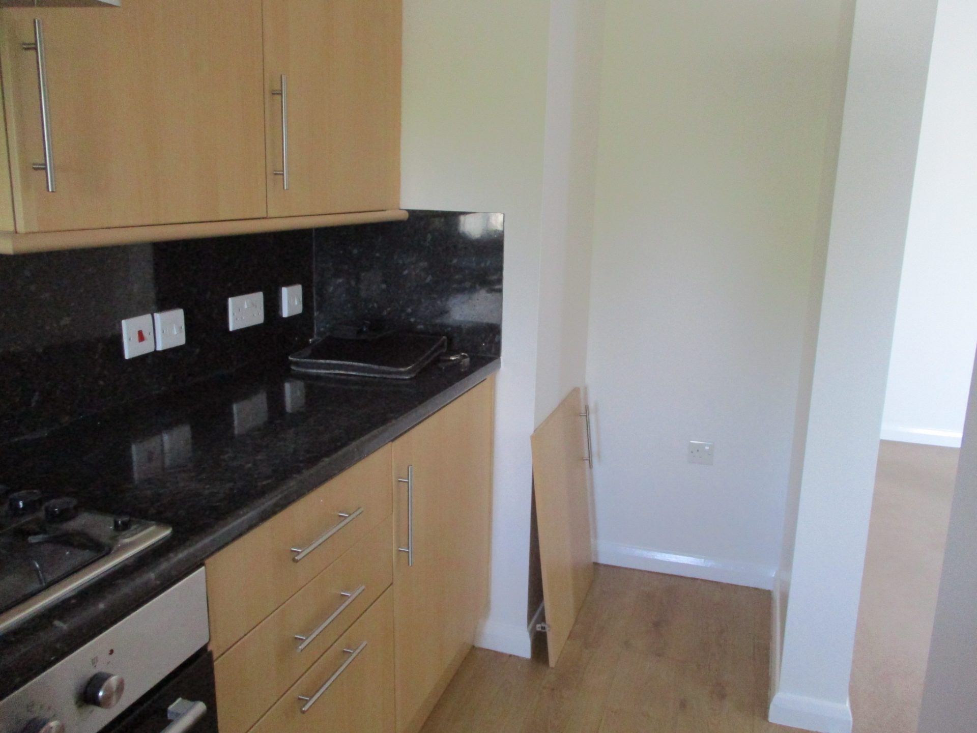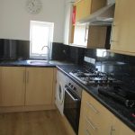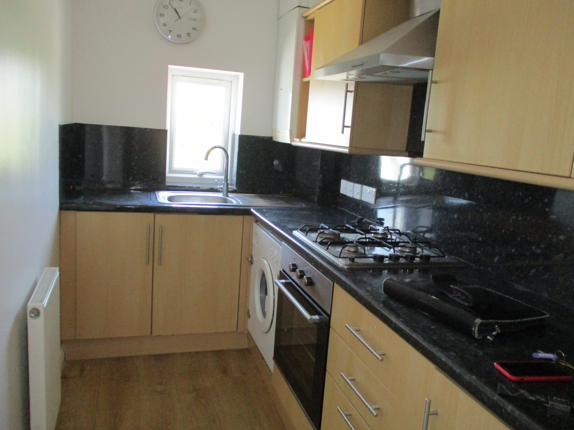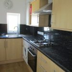 Kitchen with integrated electric oven and gas hob. Also with washing machine and fridge freezer